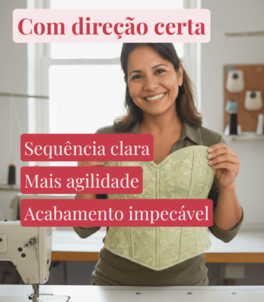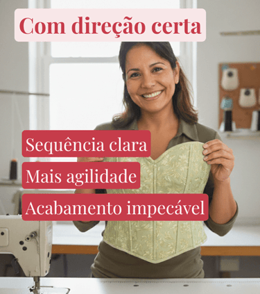 Aqui você vai saber exatamente o que costurar, em que ordem e como montar o corset com segurança, seguindo uma sequência clara que elimina a confusão e faz a peça ganhar forma de verdade.